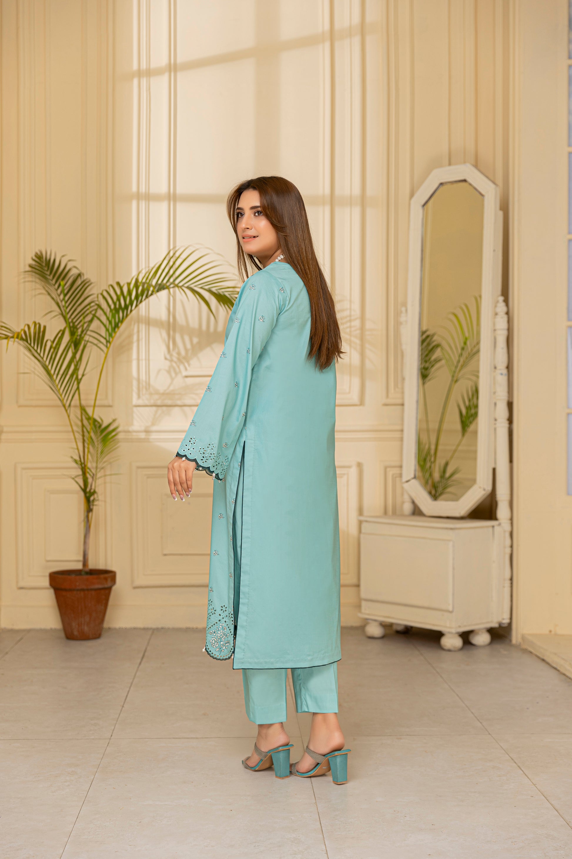 Cool and refreshing, Bahaar-e-Noor in soothing aqua mirrors the calm of clear summer skies. The shirt is detailed with off-white floral embroidery and subtle mirror embellishments along the neckline and daman. With wide-leg culottes trimmed in lace, this ensemble offers graceful comfort for beachside lunches, Eid festivities, and casual get-togethers.