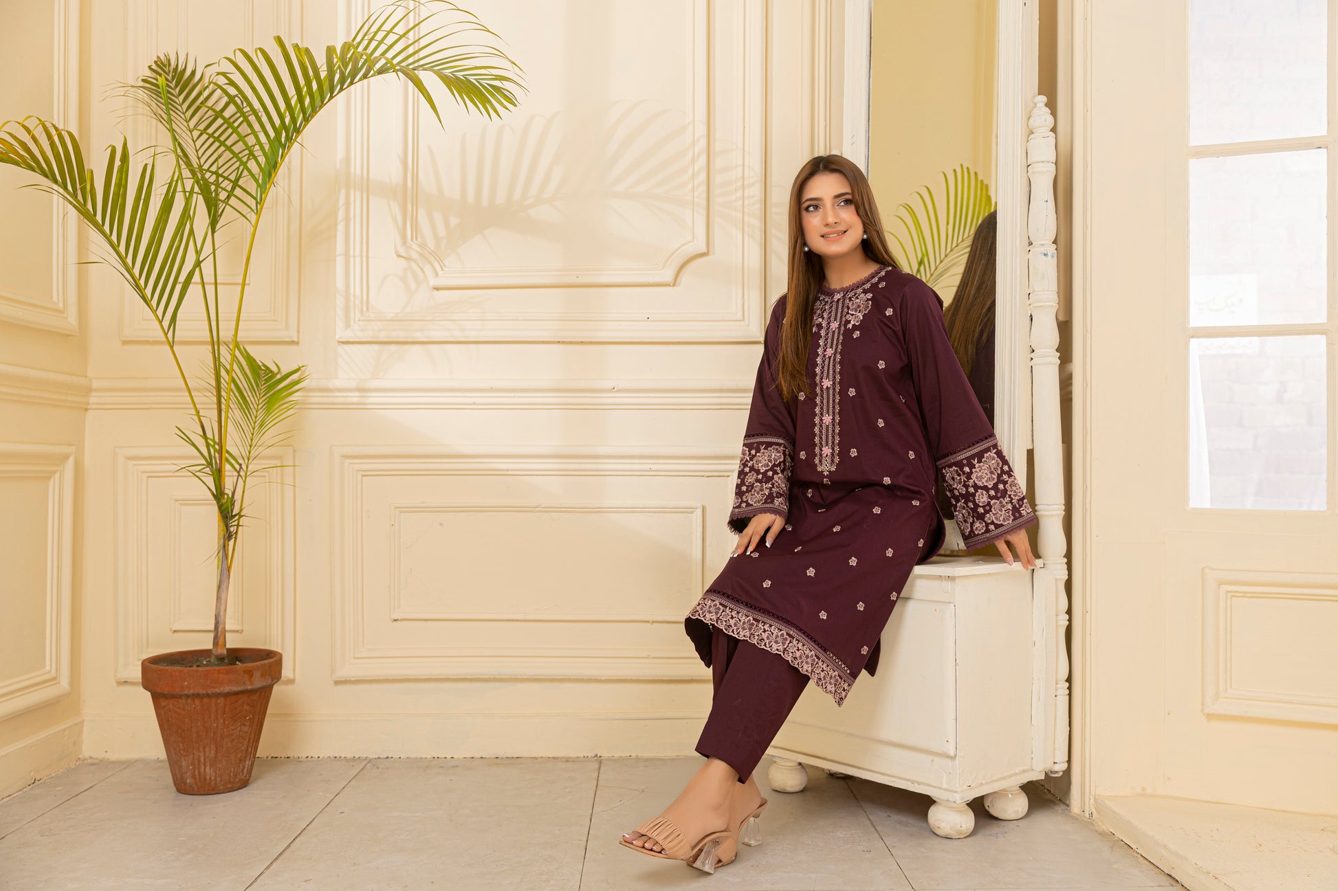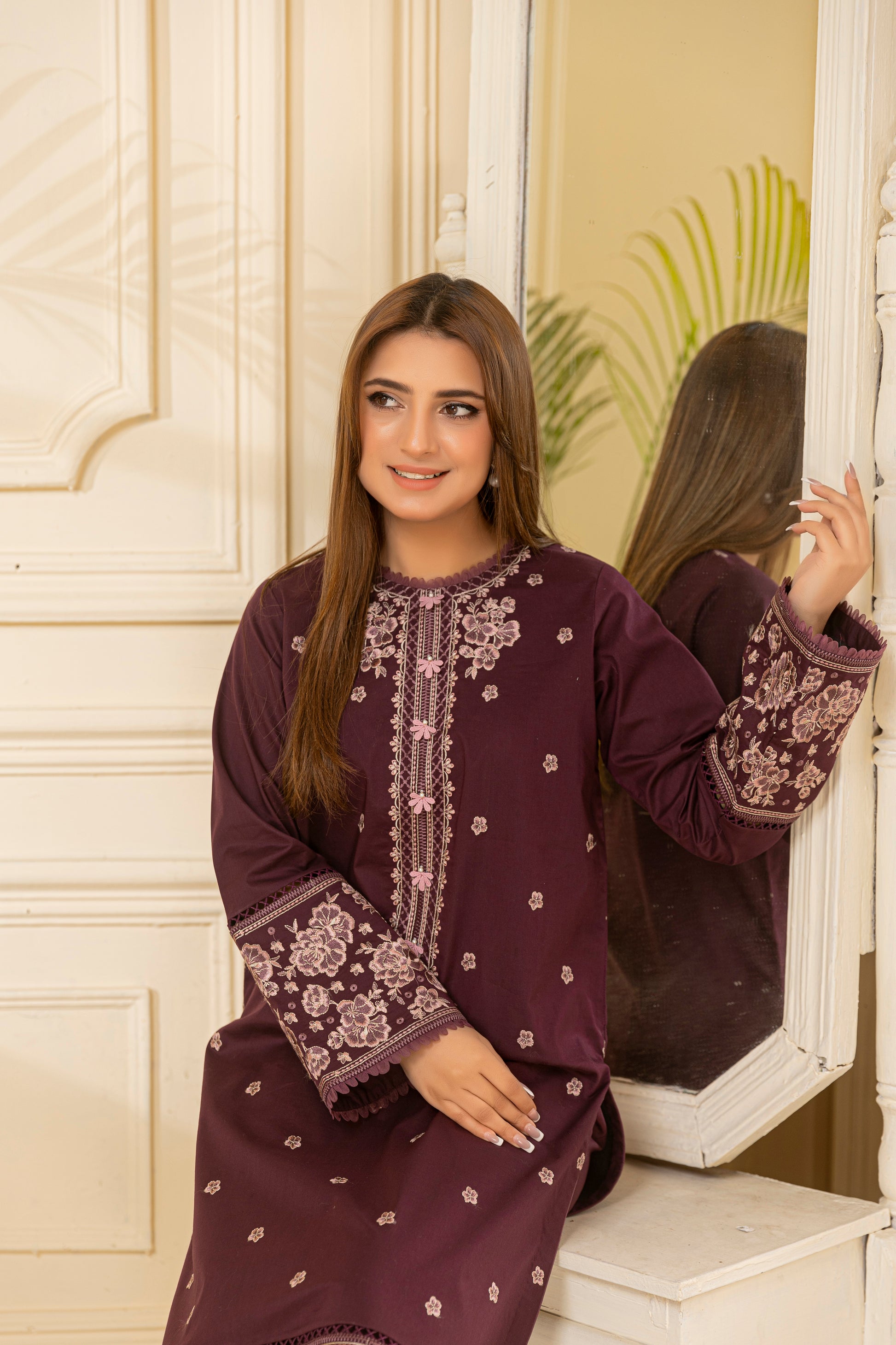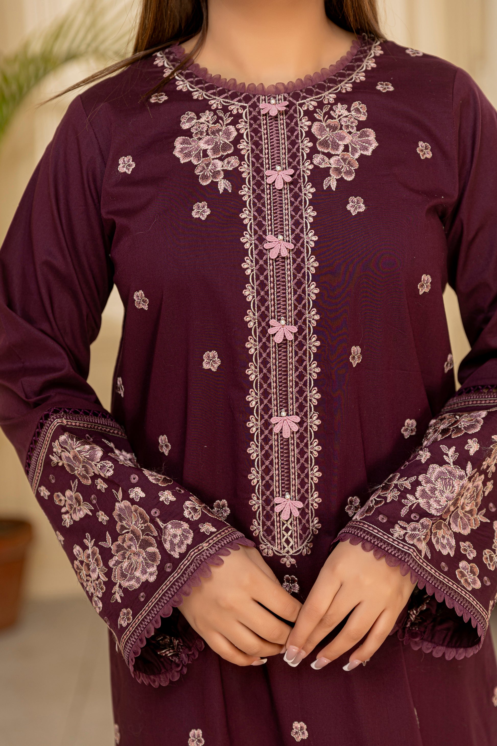 Charming and graceful, Elnaz in soft purple is a subtle statement of refined beauty. The off-white floral embroidery and mirror accents along the neckline and borders add depth and detail to this breezy design. The lace-trimmed culottes complete a look that's perfect for spring gatherings, Eid, or everyday wear.