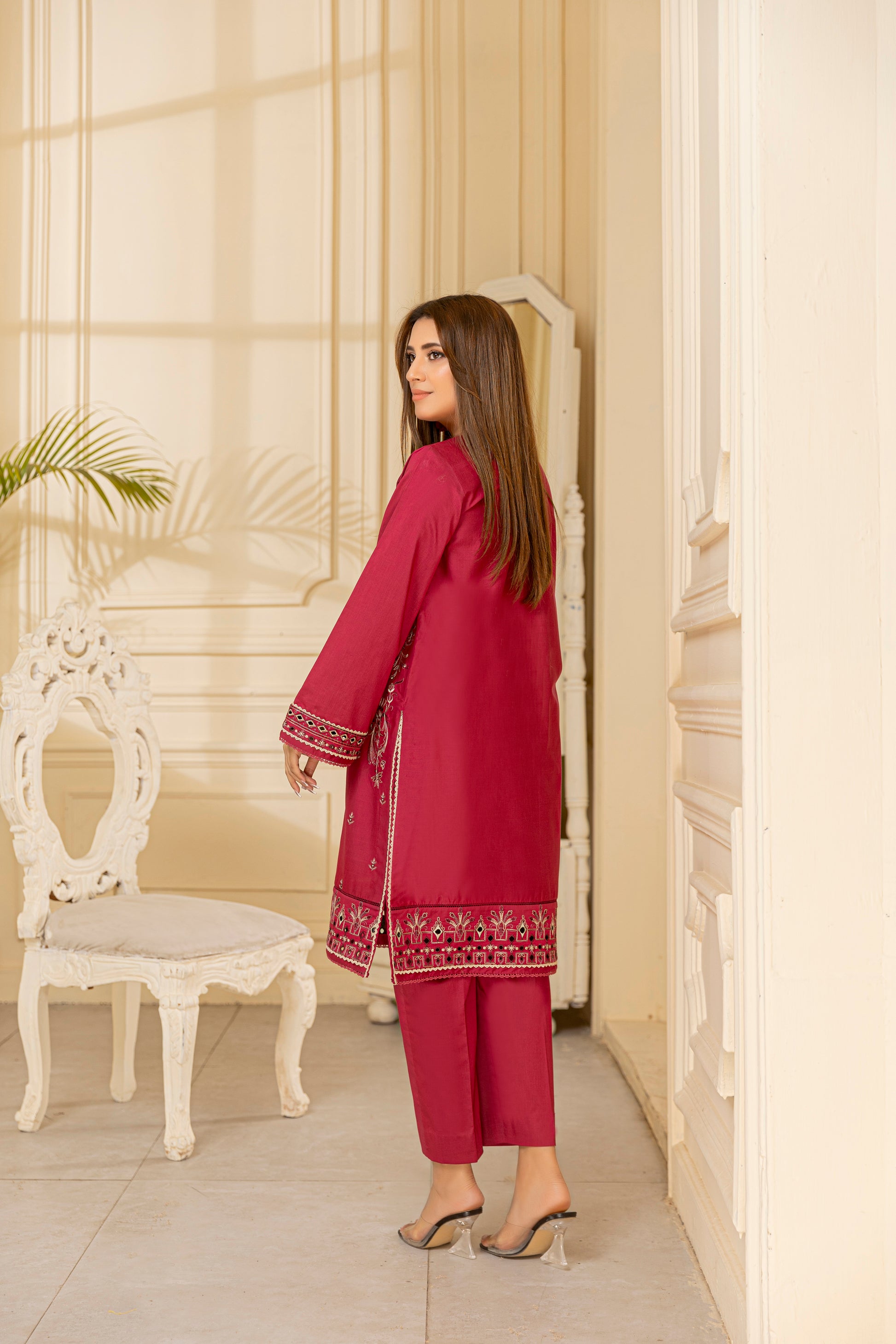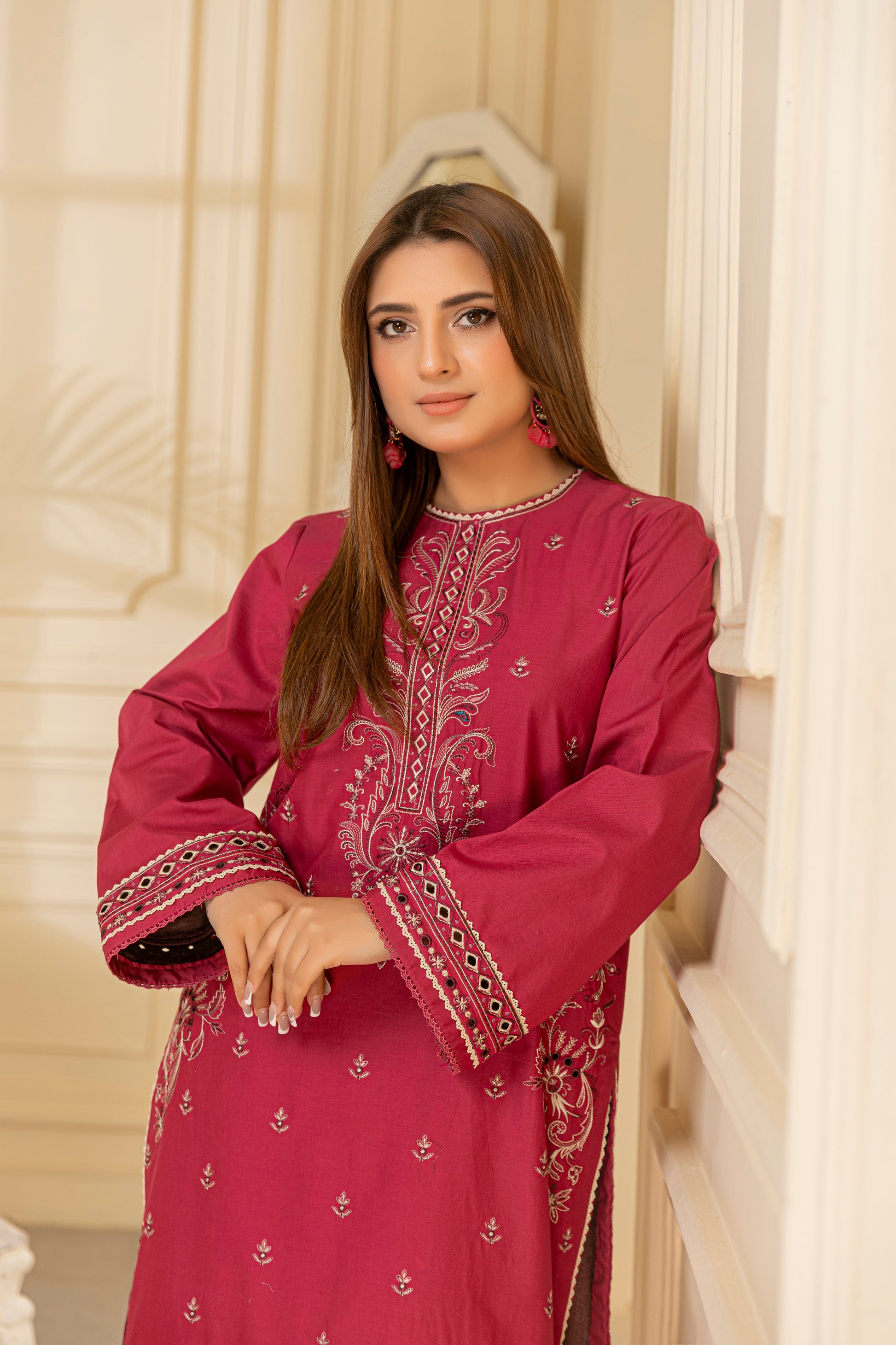 Bright as a spring garden in bloom, Gul Bahaar features delicately embroidered white floral motifs on a warm mustard lawn base. The shirt is beautifully detailed with scalloped embroidery along the neckline and daman, while the matching culottes are adorned with lace panel inserts for a graceful touch. Light, breathable, and effortlessly elegant — it’s the perfect choice for daytime events, casual get-togethers, and Eid festivities.