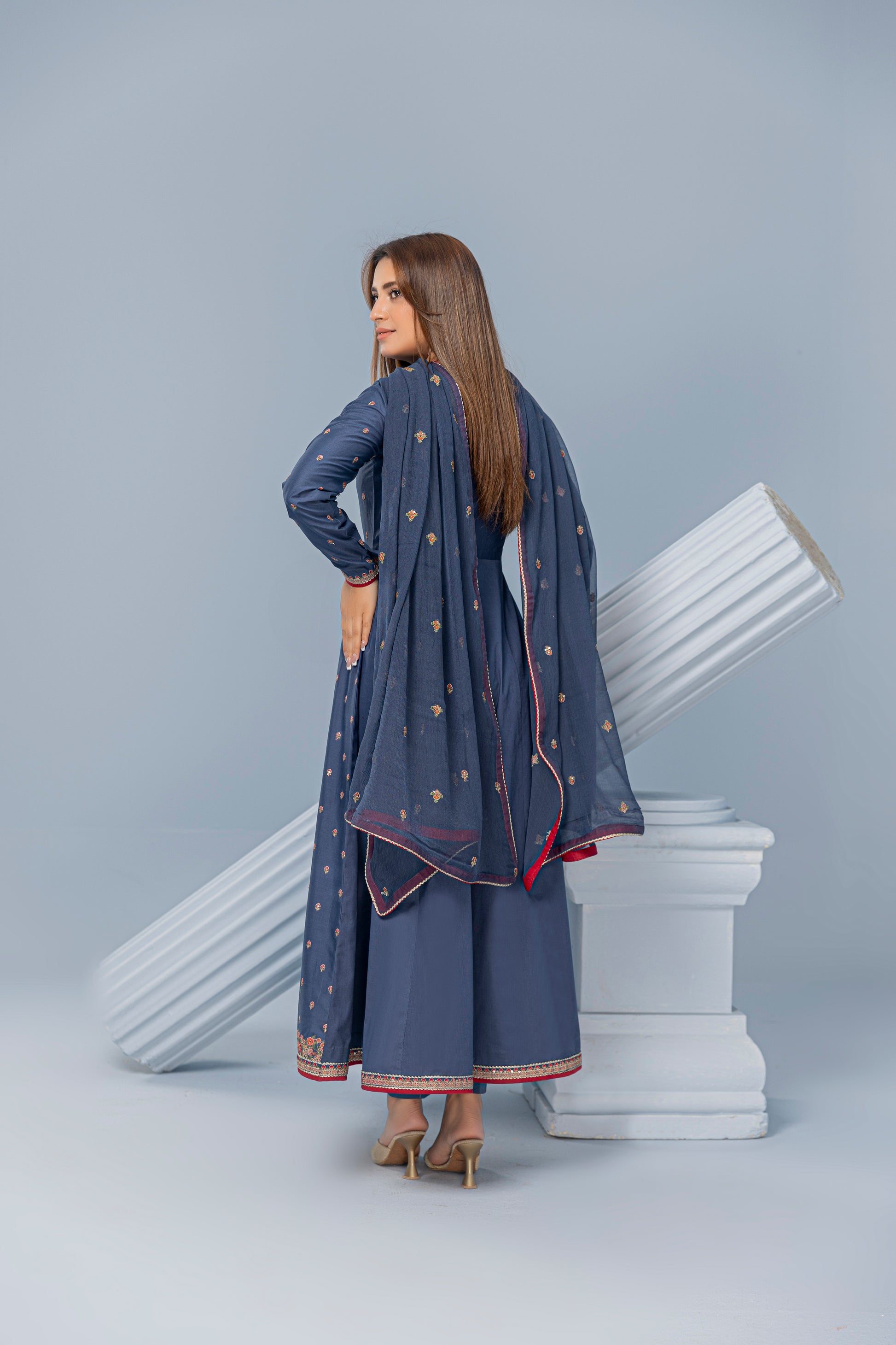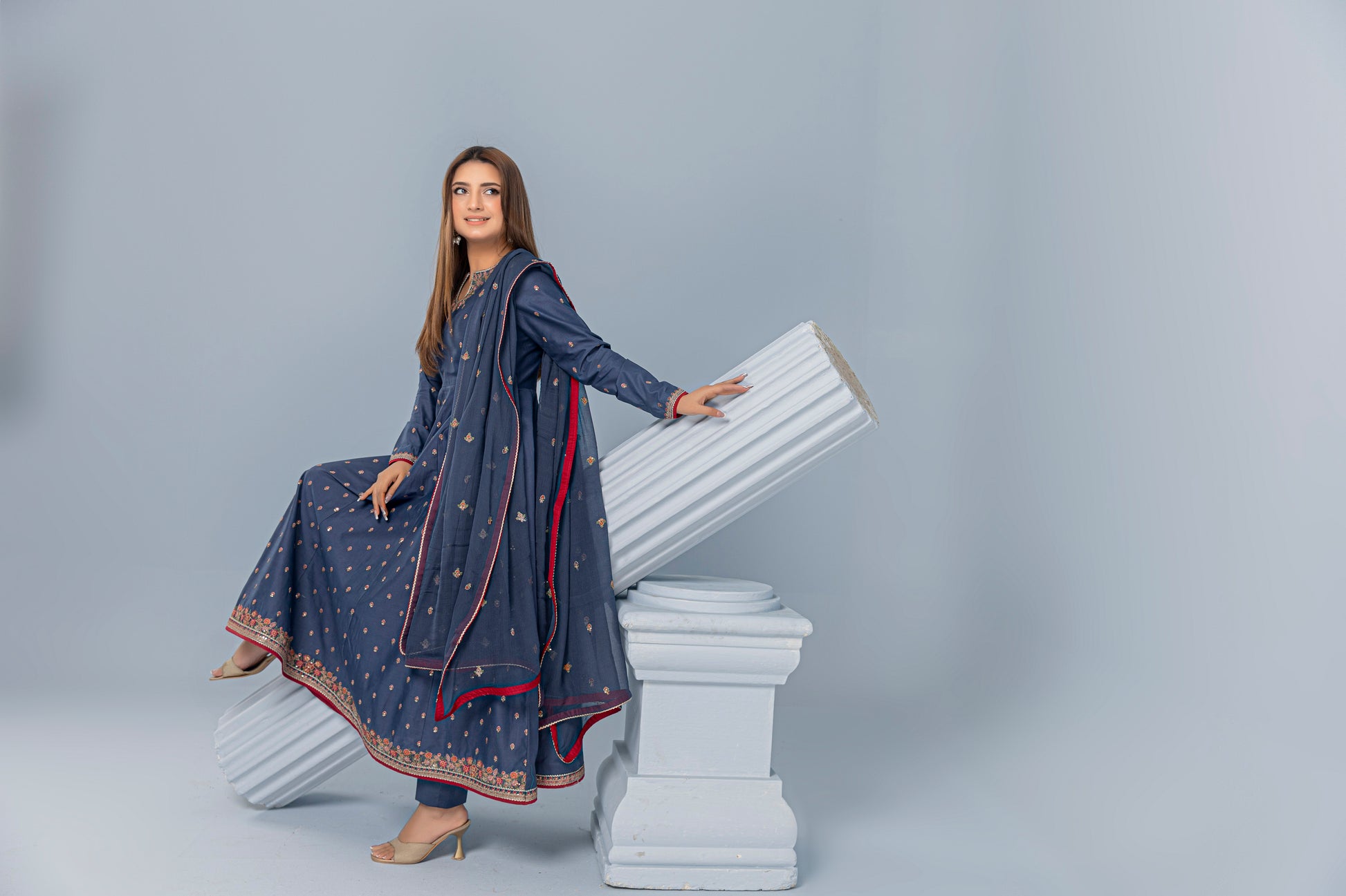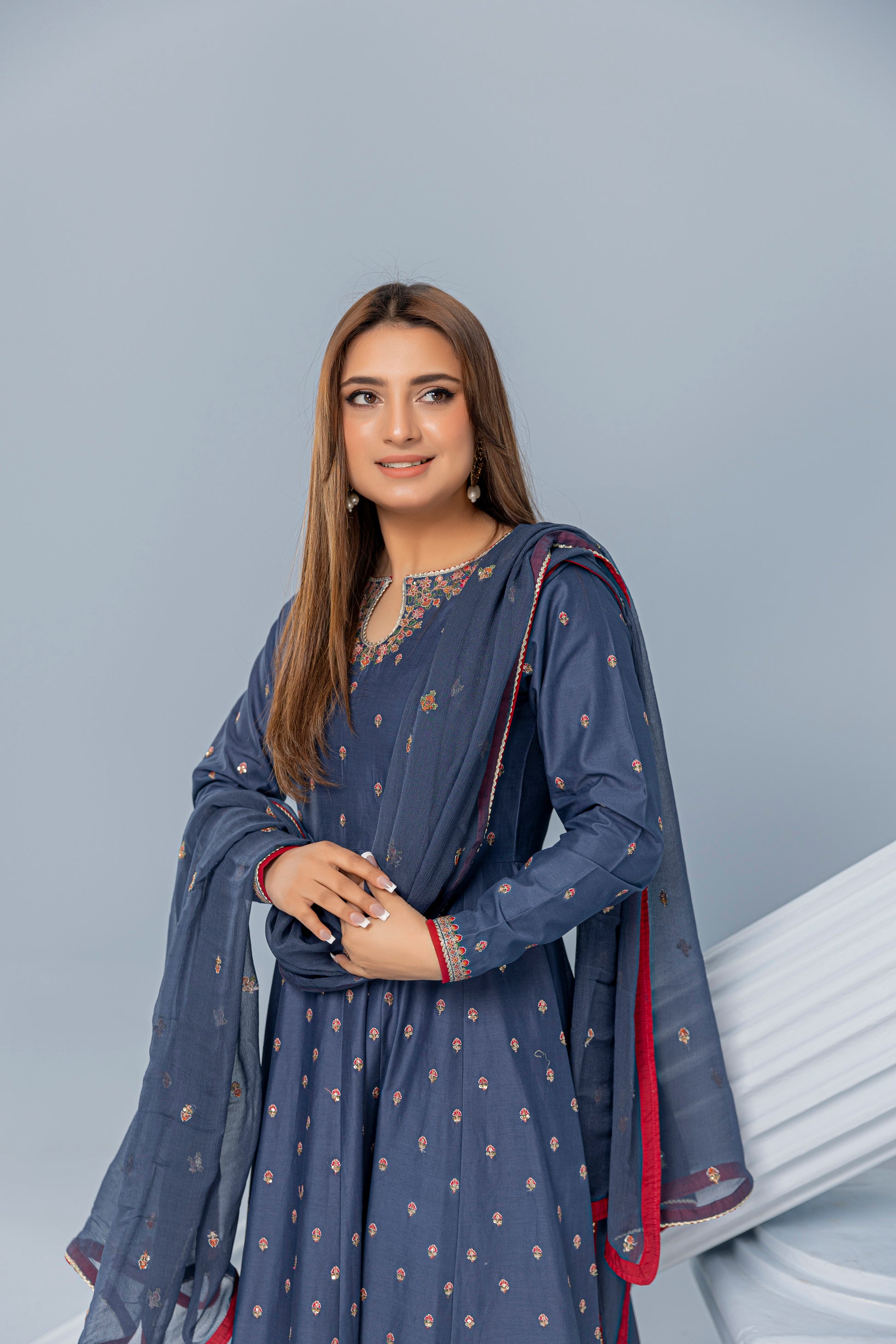 Bold yet graceful, Zimal in classic black is the epitome of timeless elegance. The embroidered shirt features intricate floral detailing with mirror accents, beautifully balanced with wide-leg lace-trimmed trousers. The printed chiffon dupatta adds a soft, flowing finish — perfect for festive evenings and chic daytime gatherings.